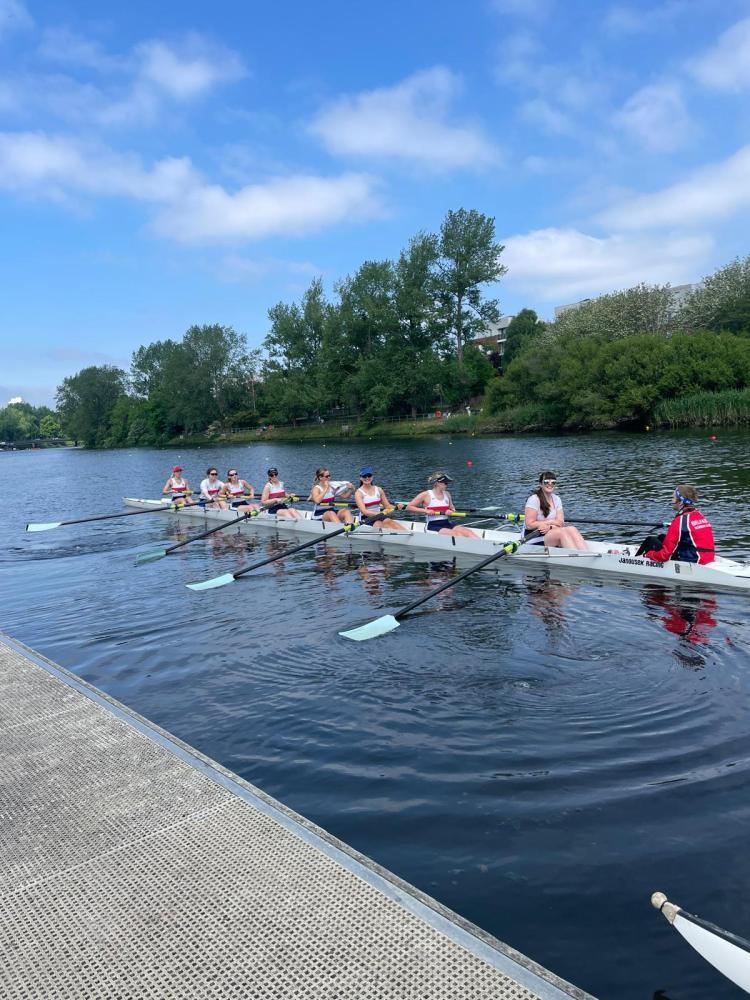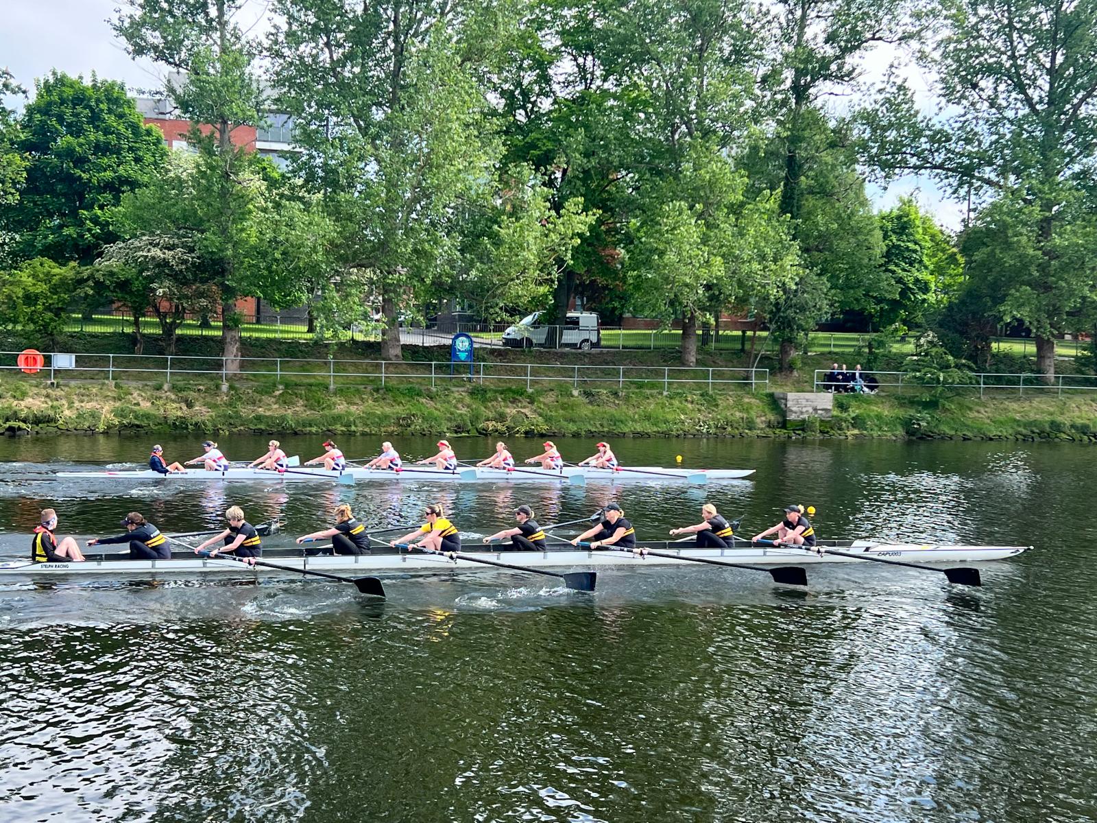 Final of the Women’s Masters Eights. Nearest: Portora BC, Furthest: Belfast RC